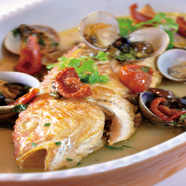 - 旬の魚介をふんだんに使った人気メニュー「鮮魚のアクアパッツァ」。